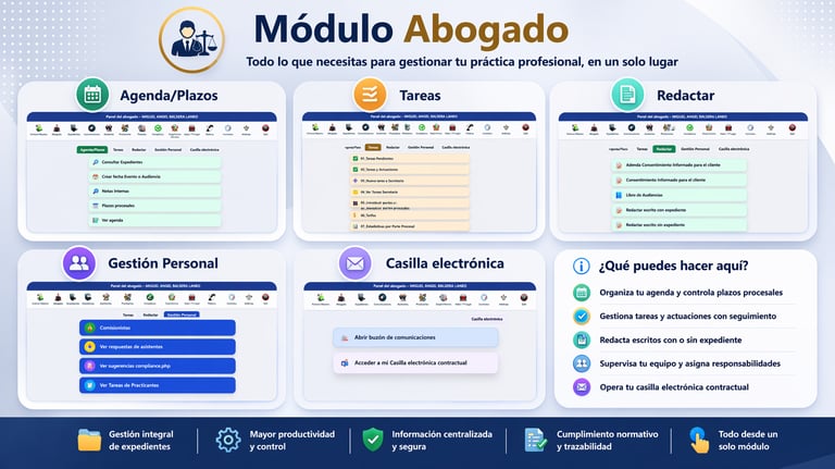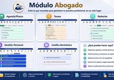 En este modulo se registran las tareas del abogado, los plazos y su agenda, la opción de redactar documentos con o sin expediente, el control del personal y la casilla electrónica con el administrador del aplicativo.