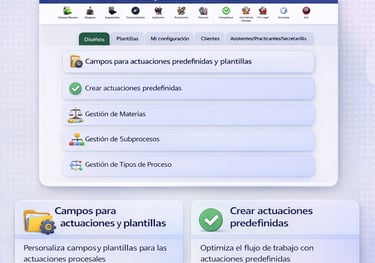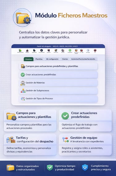 En este módulo se registran y configuran los datos base que estructuran el funcionamiento de tu despacho. Aquí se definen los elementos clave con los que operarás en el sistema, garantizando coherencia, orden y una gestión eficiente de toda la información jurídica