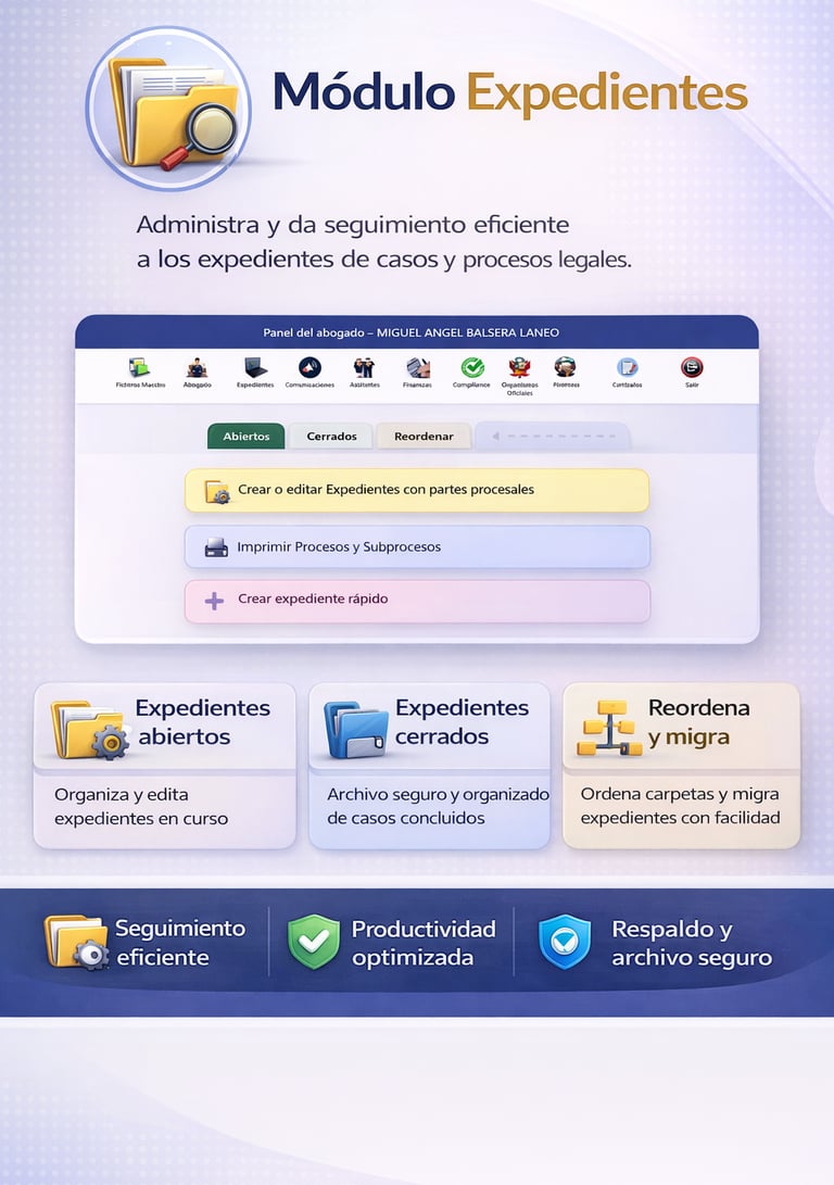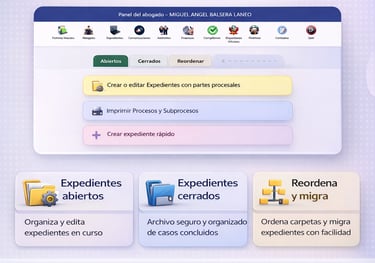 En esta sección podrás conocer, de forma clara y detallada, las funcionalidades que integran cada uno de los módulos del sistema. Cada componente ha sido diseñado para cubrir áreas clave de la gestión jurídica, permitiéndote organizar, automatizar y supervisar tu despacho con un enfoque integral, eficiente y orientado a resultados..
