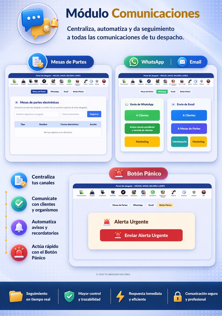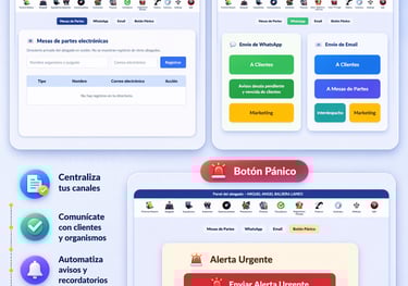 Centraliza y gestiona todos los canales de contacto de tu despacho en un solo lugar. Permite enviar escritos a mesas de partes electrónicas, comunicarte con clientes vía WhatsApp, gestionar correos electrónicos y activar alertas urgentes con el botón pánico. Todo con trazabilidad, rapidez y control de cada envío.