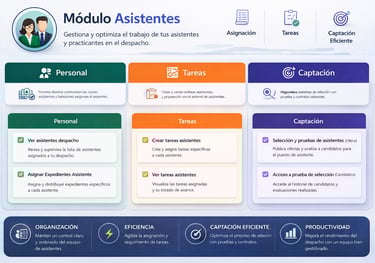 Este módulo permite gestionar de forma integral a los asistentes y practicantes del despacho, optimizando la organización interna y la distribución del trabajo. Incluye funcionalidades para supervisar el personal, asignar expedientes, crear y controlar tareas, así como evaluar el desempeño del equipo.