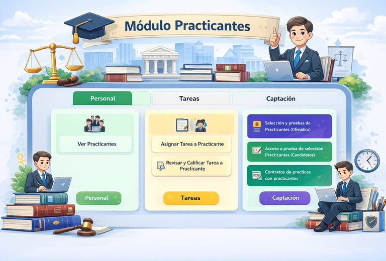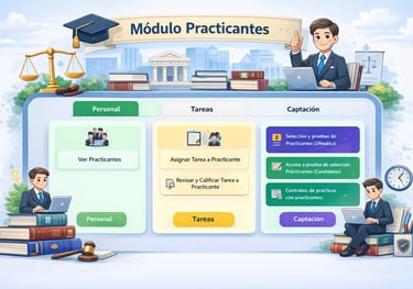 Este módulo permite gestionar de manera eficiente a los practicantes del despacho, integrando su supervisión, asignación de tareas y procesos de formación. Facilita el seguimiento de actividades, la evaluación del desempeño y la correcta distribución de funciones, garantizando un control ordenado del trabajo en apoyo a la labor jurídica.