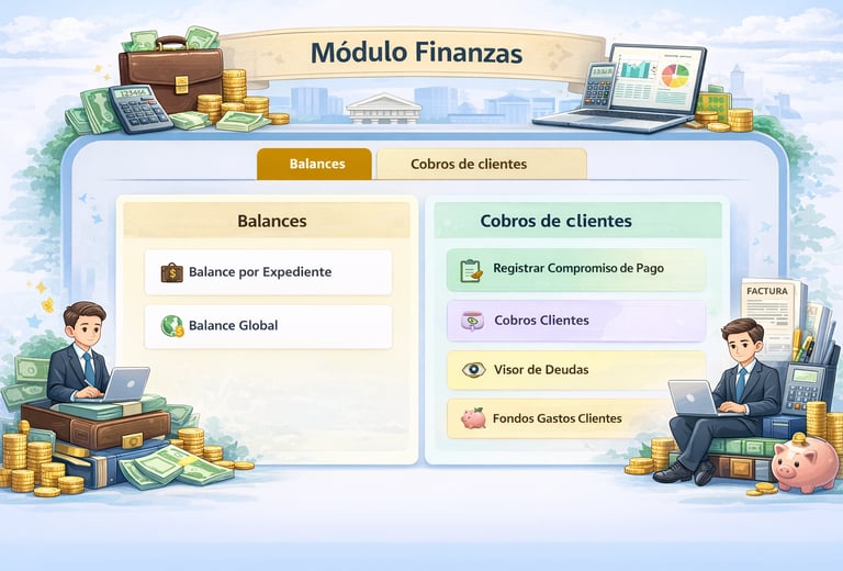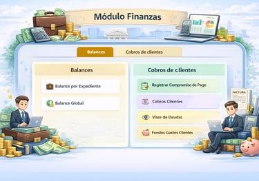 El módulo de Finanzas permite gestionar de forma integral la situación económica del despacho y de cada expediente. Incluye herramientas para visualizar balances por expediente y globales, registrar y controlar compromisos de pago, llevar el seguimiento de cobros a clientes, así como un visor de deudas y control de fondos y gastos asociados. Todo ello facilita una administración transparente, ordenada y eficiente de los recursos económicos, conforme a los principios de contabilidad ordenada y veraz y de diligencia profesional en la gestión económica