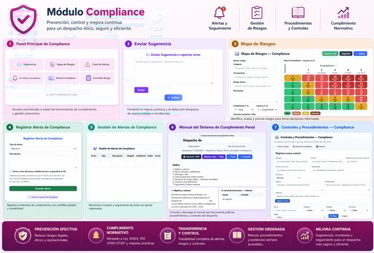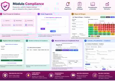 El Módulo Compliance constituye una herramienta integral diseñada para garantizar el cumplimiento normativo, la prevención de riesgos legales y la mejora continua dentro del despacho profesional. Permite identificar, evaluar y gestionar riesgos mediante mapas de riesgos estructurados, así como registrar, supervisar y dar seguimiento a alertas de cumplimiento, incluso de forma confidencial.