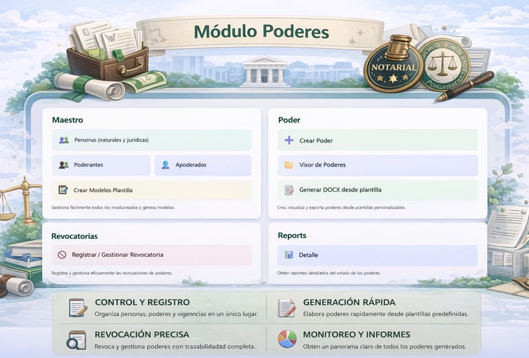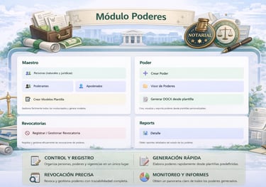 El Módulo Poderes permite la gestión integral de poderes notariales dentro del despacho, facilitando el control, generación y seguimiento de las facultades de representación otorgadas por personas naturales o jurídicas. Incluye el registro organizado de poderdantes y apoderados, así como la creación de modelos de plantillas que agilizan la elaboración de documentos conforme a las necesidades del caso.