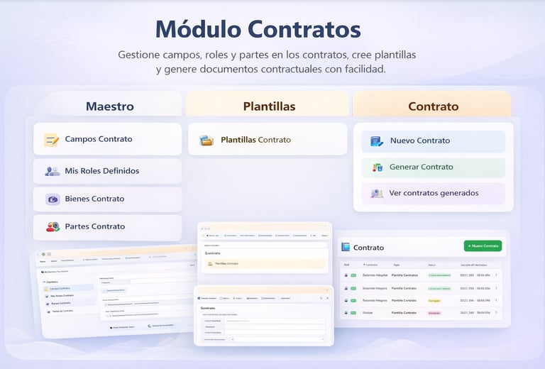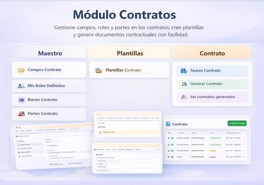 El Módulo de Contratos permite gestionar, crear y generar documentos contractuales de forma rápida y estandarizada. Incluye la administración de campos, roles, partes y plantillas, facilitando la elaboración automatizada y el control de contratos emitidos.
